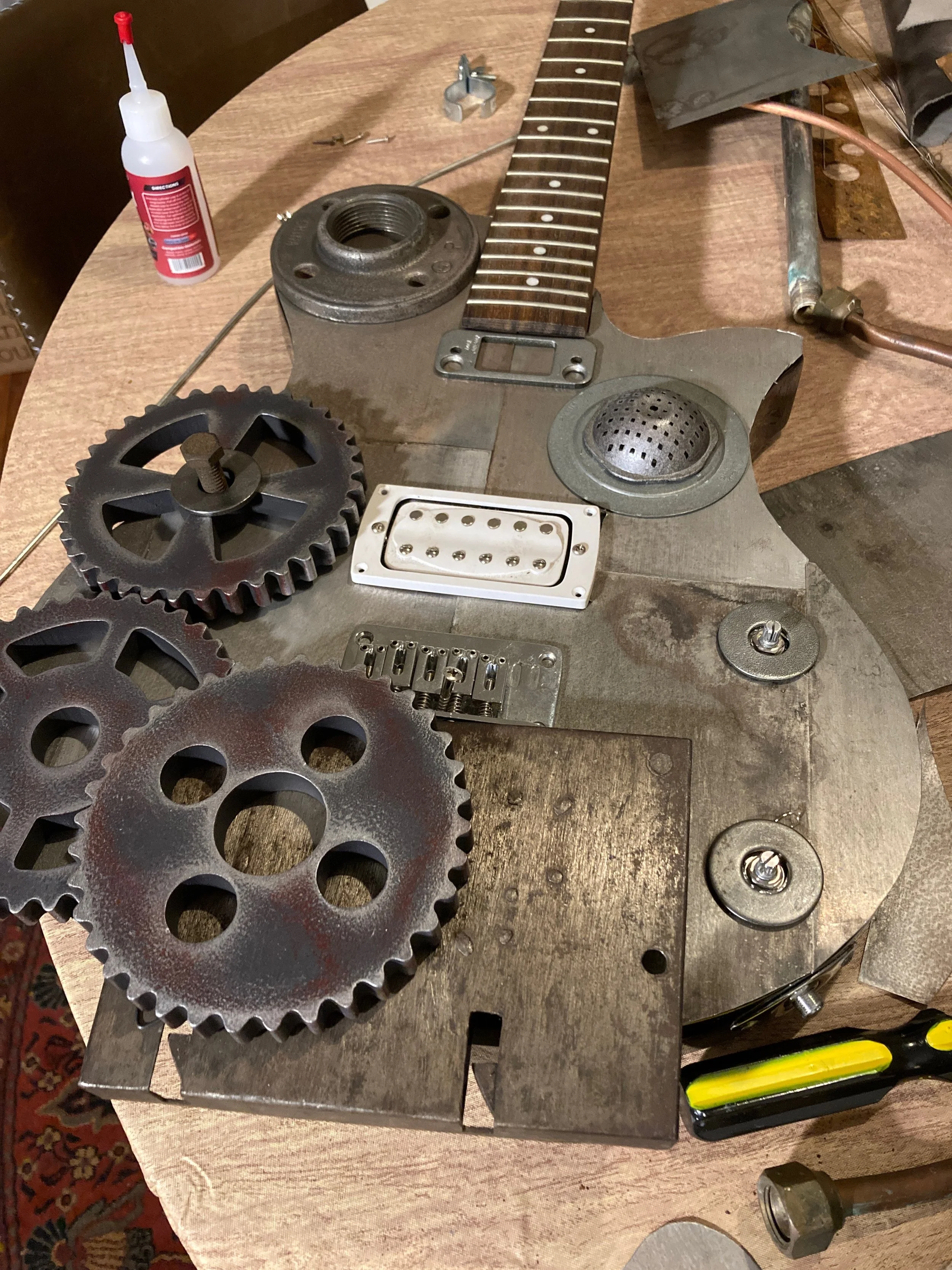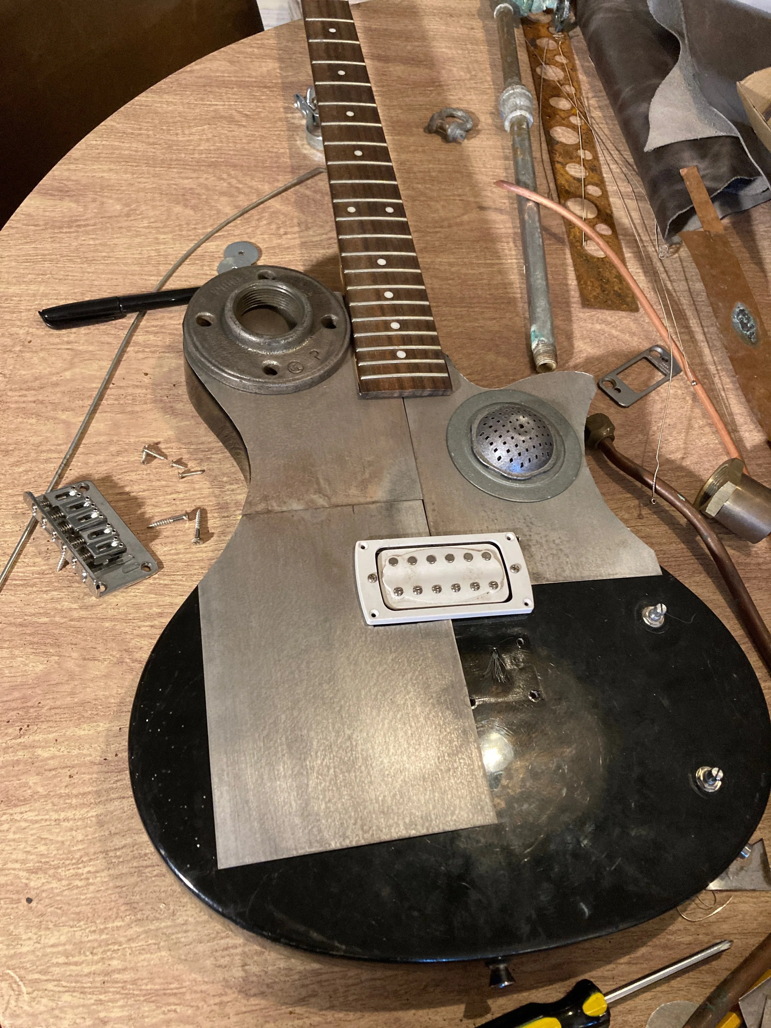 The guitar became a structure to build onto. Found objects, hardware, pipes, wood, metal, plastic, wire, and leather were layered and worked into the surface. Each element was adjusted, painted, patinaed, and distressed, creating a piece that feels cohesive, but built over time.
